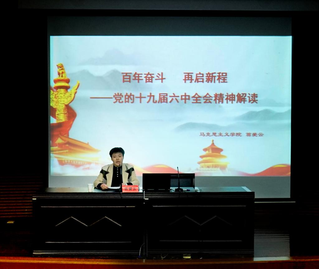 翁爱云向同学们介绍了十九届六中全会召开的概况,解读了十九届六中全会的重要理论成果,并围绕“一个主题”“两个始终”“三个历史性飞跃”“四个阶段”“五点意义”深刻阐释了党的百年奋斗重大成就。最后,她勉励青年大学生要把思想和行动统一到全会精神上来,全面贯彻习近平新时代中国特色社会主义思想,大力弘扬伟大建党精神,不断加强自我修养,做有志气、有骨气、有底气的新时代青年,为实现第二个百年奋斗目标、实现中华民族伟大复兴的中国梦而不懈奋斗。