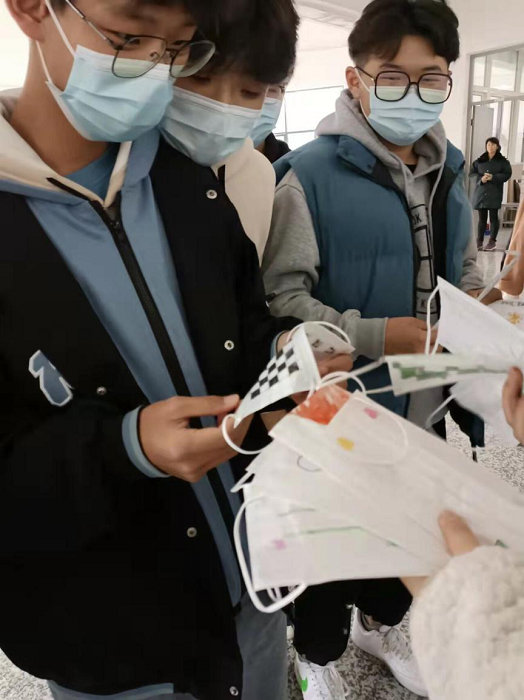 B产品201学生为校园行人免费发送自己设计制作的口罩