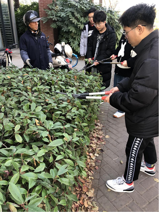 绿化养护师傅为B环艺203班学生示范慈孝竹的修剪养护