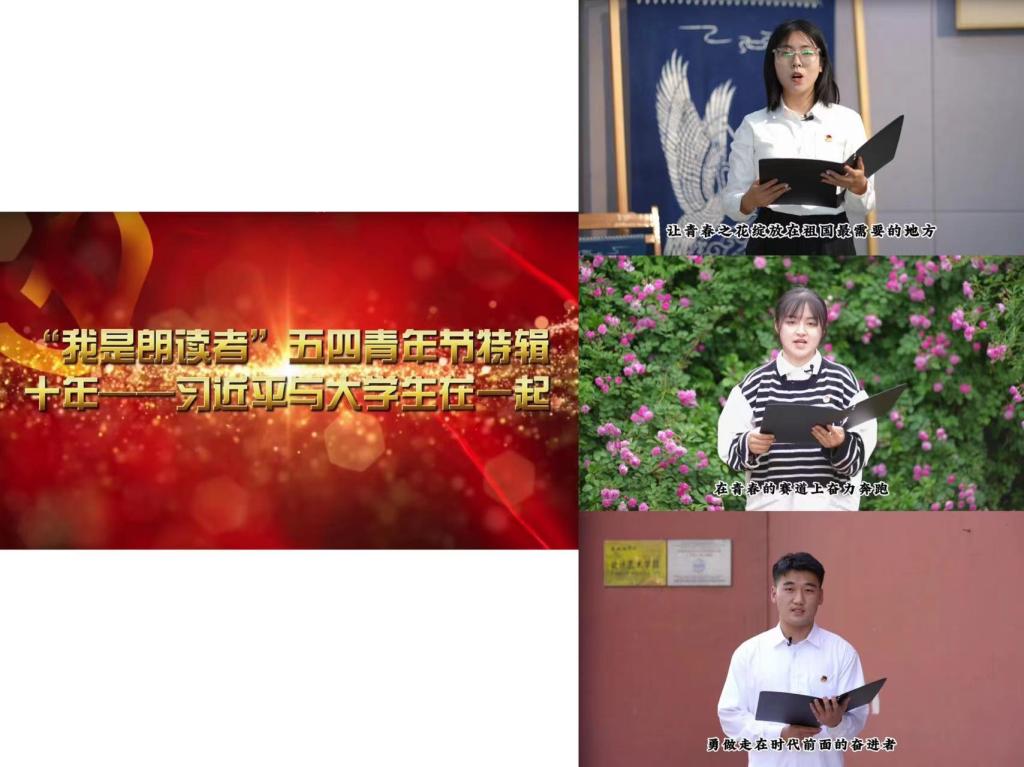 “我是朗读者五四特辑”,回望十年寄语,激发青年斗志。学院团委以习近平总书记在考察高校时、在给大学生的回信中对当代青年的寄语为主题,以团员接力朗读的形式录制“我是朗读者五四青年节特辑”视频,并在学院公众号上向全院学生推送。从“人生的扣子从一开始就要扣好”到“在青春的赛道上奋力奔跑”,团员青年们用铿锵有力的语言朗读了习近平总书记的谆谆教诲,激励广大青年更好地学习理解青年责任与担当,汇聚青春奋斗、奋力赶超的强大精神力量。