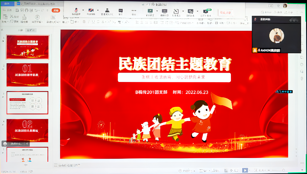 各班级利用班级QQ群,积极宣传民族团结进步宣传月活动。利用线上团日活动的形式,集中学习习近平总书记在全国民族团结进步表彰大会上发表的重要讲话精神,学习我国民族政策、观看广西民族团结进步主题宣传片、学习少数民族歌曲;开展朗诵经典民族团结故事、爱国诗词赏析等活动,加强对铸牢中华民族共同体意识的阐释解读和深化转化;以民族团结进步为主题录制视频,分享学习心得体会;举办以民族精神为主题的书法展示,以笔化情,书写对民族团结的坚定之情。