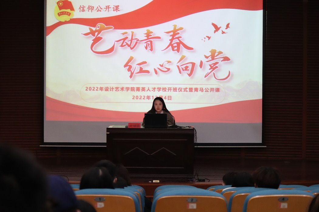 开班仪式后,叶禎菲以《艺动青春 红心向党》为题作首场青马公开课。她带领学员们认真学习党的二十大报告中的新理论、新思想、新战略,并与学员们共同观看和讨论中国政法大学郭继承教授的“国之运势”思政课堂视频,引发青马班学员强烈共鸣。B视传201班曹乐阳表示,“00后”伴随着改革开放、国家发展的成果而成长,从小看到生机勃勃、国运昌盛的中国,对国家充满自信,并且能理性看待国际形势。作为新时代青年,我们要自觉主动接受党的科学理论武装和实践锻炼,期待未来能为祖国发展贡献青春力量。