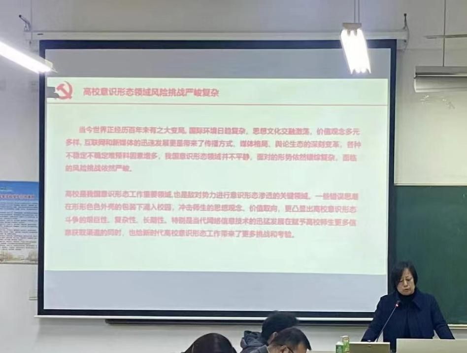 胡凌霞分析了当前高校意识形态领域面临的严峻风险挑战,她指出,高校是我国意识形态工作重要领域和前沿阵地,也是敌对势力进行意识形态渗透的关键领域,一些错误思潮在形形色色外壳的包装下涌入校园,冲击师生的思想观念、价值取向,高校意识形态斗争具有艰巨性、复杂性和长期性。胡凌霞通过剖析多个高校意识形态领域典型案例,警示广大教师要充分认识意识形态工作的极端重要性,在日常教学工作中要严守政治纪律、政治规矩,增强遵守“新时代高校教师职业行为十项准则”的思想自觉和行动自觉,主动积极弘扬主流意识形态,坚持用习近平新时代中国特色社会主义思想铸魂育人,坚决捍卫马克思主义在意识形态领域中的指导地位,切实维护校园安全稳定。