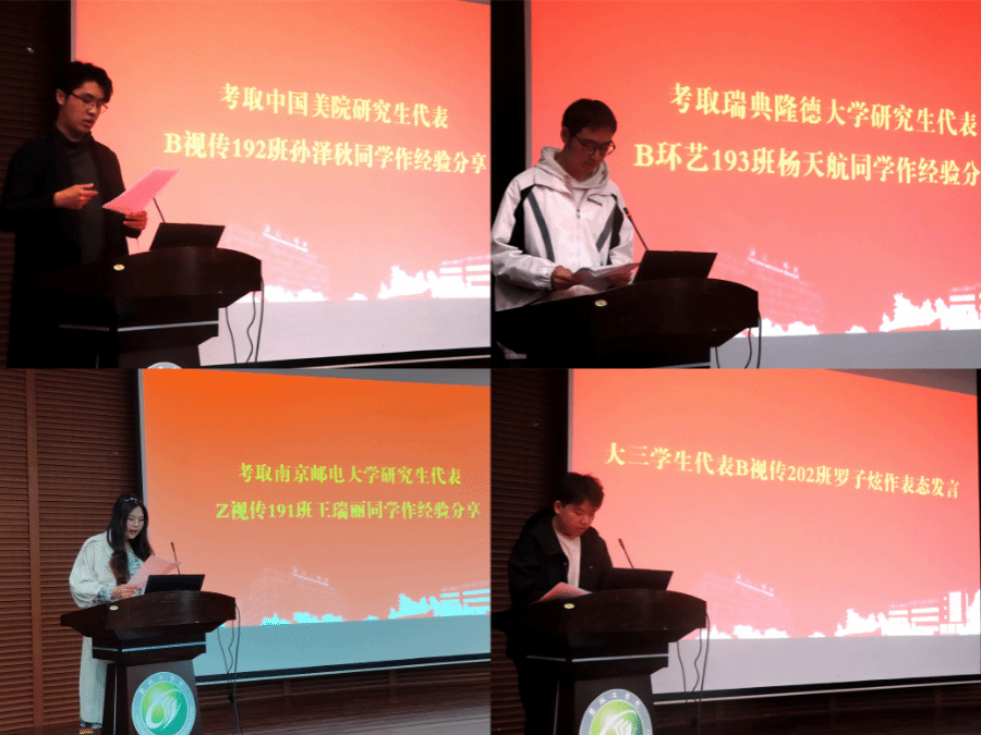 在考研经验交流环节,2023届考取国内外研究生学生代表B视传192班孙泽秋、Z视传191班王瑞丽、B环艺193班杨天航结合各自实际,从院校选择、备考技巧、心态调整等方面向参会人员分享了各自的备考历程和宝贵经验,建议同学们脚踏实地、打好基础、戒骄戒躁、坚持到底。2020级考研学生代表B视传202班罗子炫作表态发言。倡议有考研意向的同学及早规划,养成良好的学习和生活习惯,为心中的梦想不懈努力。
