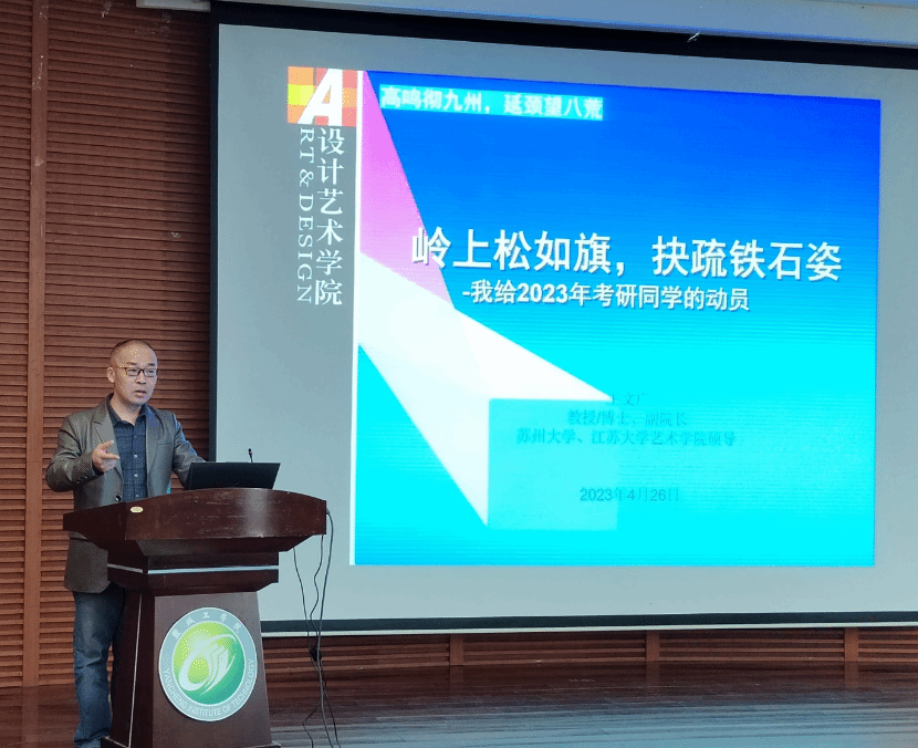 随后,王文广作题为《岭上松如旗,抉疏铁石姿》的考研动员讲话。他从为何考研、如何看考研专业课、如何择校、如何统筹时间等四方面对考研学生予以指导。他强调,考研不能只是一味刷题,要与老师、朋辈多交流,开阔专业视野,提高学习效率。他鼓励学生要坚定目信念,耐住寂寞,克服困难,坚持到底。钱峰以《设计专业考研趋势分析》为题作考研动员指导。他从《2023全国研究生招生调查报告》的数据入手,全面分析了近几年考研趋势变化,重点就考研目的及心态、专业型硕士和学术型硕士的区别、艺术设计类的考研类型等方面进行详细阐释。他结合学院近年成功上岸的毕业生典型案例,建议学生结合自身情况理性定位,选择适合自己的院校和专业,并有计划、有步骤地推进复习。