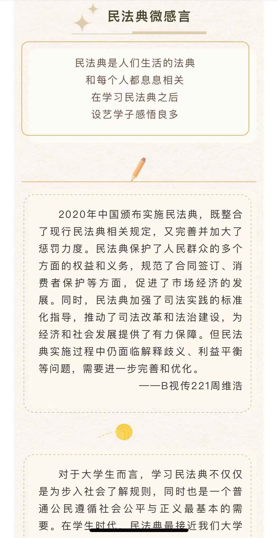 二是开展班级微感言征集活动。5月24日至30日,学院各团支部开展团日活动,学习了解民法典内容,深入理解民法典与日常生活之间的联系,引导学生不仅要遵法守法,更要有学法的主动性,真正做到学法、懂法、守法、用法。同学们踊跃参与,主动分享学习成果,活动共收集三十余条微感言,学院在微信公众号中选登部分微感言进行展示。B环艺222刘珺怡在微感言中表示:作为新时代的一名青年,要知法、懂法,学会用法律的武器保护自己,更需要严格按照法律的准绳规范自己的言行,把追求公平正义作为一种政治追求和道德情操,贯彻于学习、工作和生活的各方面、全过程。