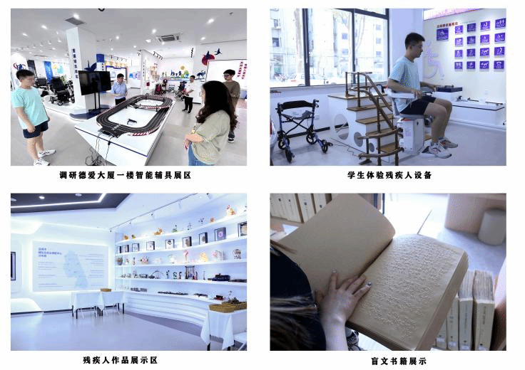 在德爱大厦一楼,通过对科技赋能区的展示,团队成员了解了目前科技在残障群体间的使用与推广,例如智能升降灶台、洗漱台、折叠多功能床等可供残障人士使用的特殊产品。