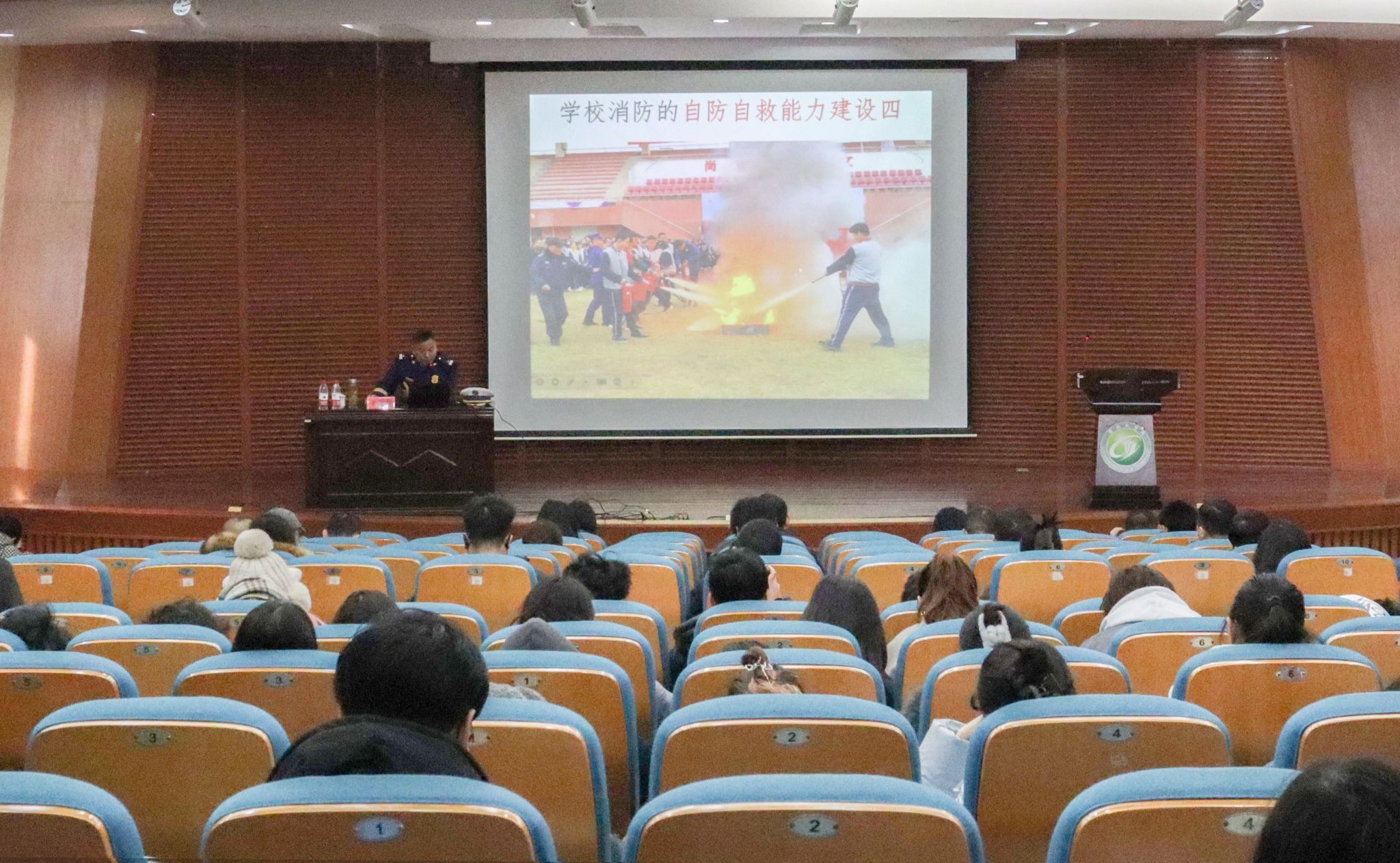 黄文胜做了题为《学好消防 幸福一生》的讲座,讲座围绕消防与生活、校园消防两个方面展开,重点结合学校消防的自防自救能力建设,为师生讲解了日常工作生活中如何做好火灾的预防,遇到突发火情时第一时间如何应急处置,如何正确报警、扑救、疏散、自救和逃生等。讲座结束后,黄文胜讲解了灭火器、消火栓等灭火器材的使用方法,并指导部分师生进行了现场演练。