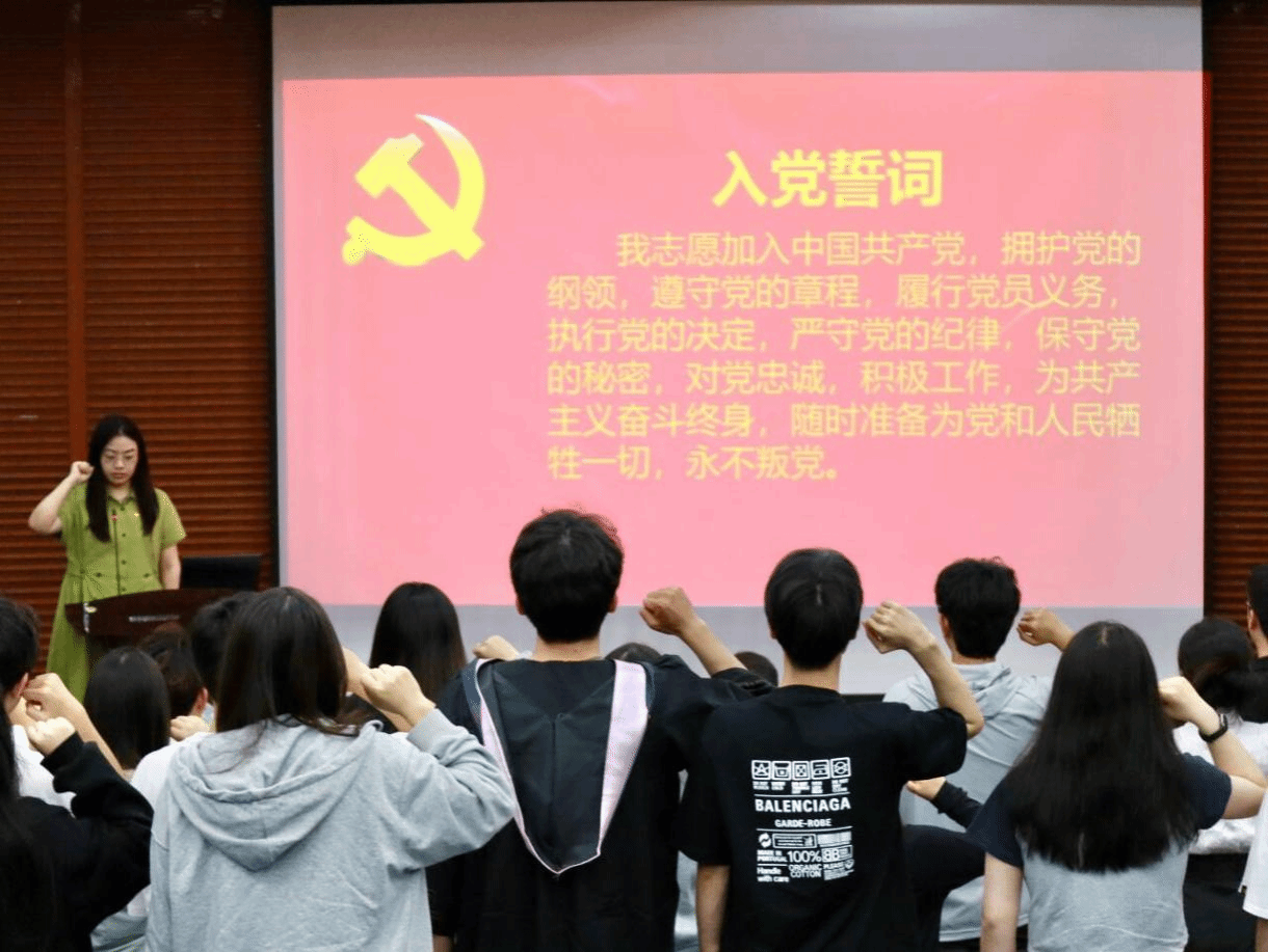 学生党支部全体党员在组织委员戴心怡的带领下庄严宣誓。支部书记顾清对光荣加入党组织和顺利转为正式党员的同学表示祝贺,她对全体党员提出三点希望:一是保持学习状态和学习精神,持续学习,深入学习,做终身学习者;二是强化拼搏意识和拼搏能力,在该奋斗的年纪不要选择躺平,做时代奋斗者;三是强化党员身份和党员意识,严格要求自己,乐于服务,甘于奉献,做先锋示范者。