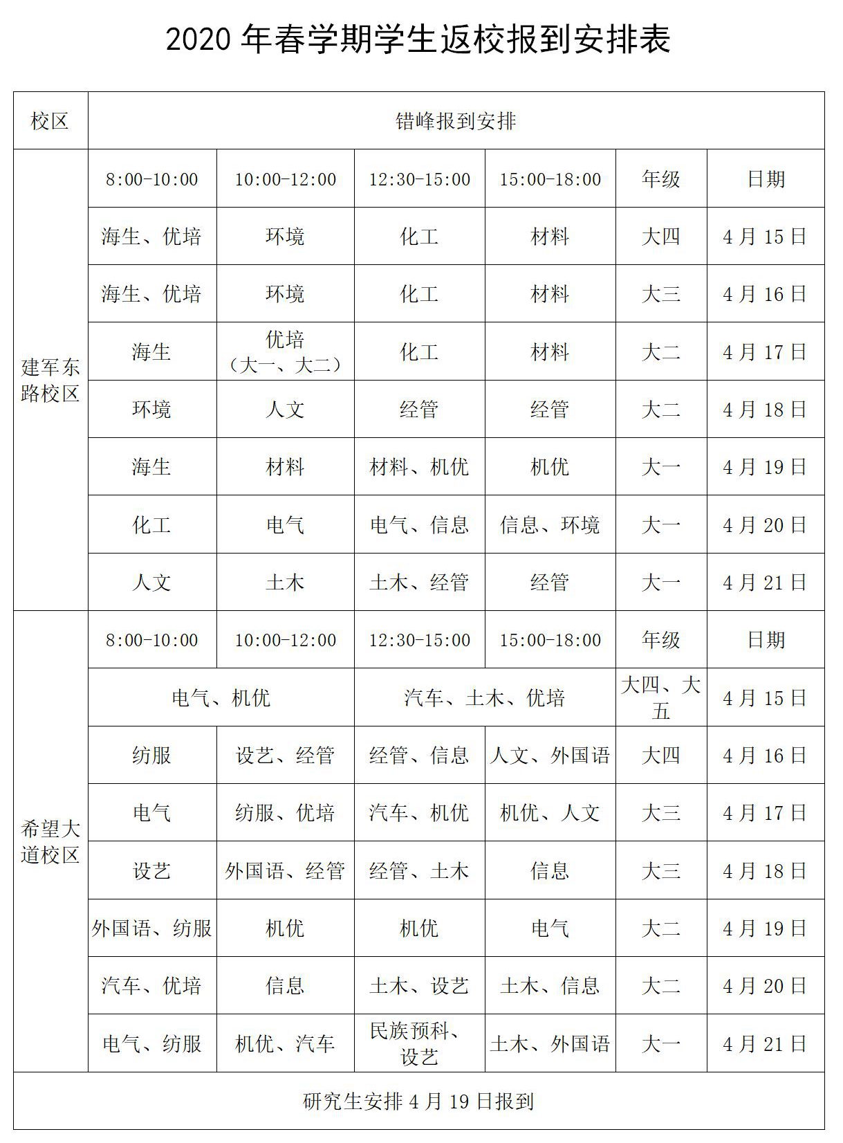 学校采取分类、分学院、分时返校,学生凭学院出具的“同意返校证明”返校报到。具体返校时间以下表为准,请同学们接到返校通知后,合理安排返校行程,并报学院统计。