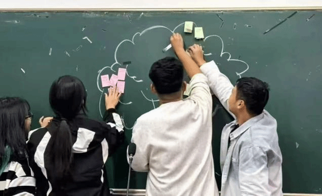 活动伊始,互动活动“大风吹”迅速点燃了现场的气氛。同学们在轻松愉快的氛围中积极参与游戏活动,陌生感渐渐消融,欢声笑语此起彼伏。这一热身环节成功调动了气氛,为后续的活动打下了良好的基础。互动游戏过后,同学们进行了分组讨论,组员之间互相介绍自己并推选出组长,完成一起起组名、制定团体规范等既定任务,并作出做出“遵守团体规则”的庄严承诺。在老师的指导下,各位同学在以小组为单位,画出了自己的大学愿景图,组成一棵棵大学愿景树,创作出了一幅幅充满创意和想象力的作品,表达自己对未来的期望。