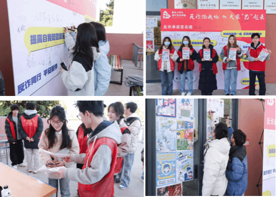 3月19日中午,365英国上市集团在南校区润美楼前开展“反诈你我他,大家‘艺’起来”防范电信网络诈骗教育主题活动。活动现场,由学生自主设计的反诈主题海报成为本次活动焦点,作品以“刷单陷阱”“虚假投资”“网络交友诈骗”等真实案例为灵感,通过海报和手抄报等形式,生动揭露诈骗套路。志愿者们还通过情景模拟问答、案例解析宣传册发放等形式向同学们普及常见的诈骗手段和实用的防骗技巧。在充分了解反诈知识后,同学们纷纷来到签名墙前,郑重签下自己的名字,表达积极参与反诈行动、守护财产安全的坚定决心。