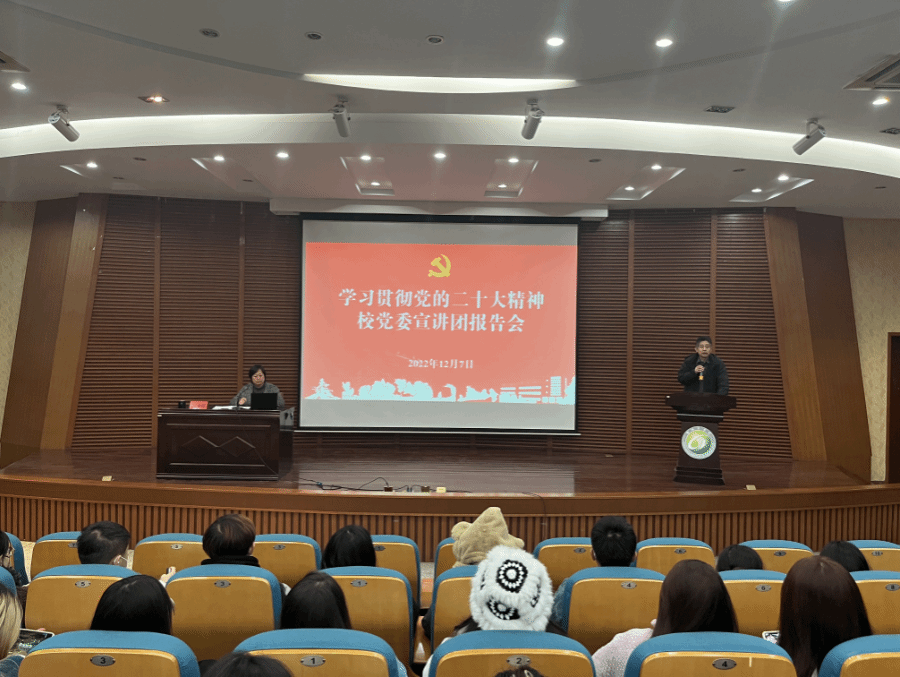 为全面深入学习领会党的二十大精神,扎实推进学习宣传贯彻工作,按照校党委安排部署,12月7日晚,365英国上市集团在南校区润美楼报告厅举行党的二十大精神宣讲会,学院党总支书记胡凌霞作题为《自信自强,团结奋斗,以中国式现代化全面推进中华民族伟大复兴》的报告。院长张军主持宣讲会,20级全体学生参加。