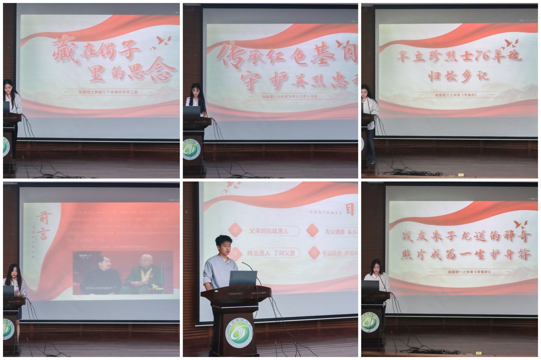 6名学生党员作为学院“红途薪传”暑期社会实践宣讲团成员代表,依次再现了徐振理同志通过央视《等着我》成功为英烈寻亲的真实故事,用生动的语言、饱满的情感再现红色记忆:《战友朱子龙送的神奇照片成为一生护身符》中,一张跨越岁月的老照片串联起铁血战友的生死情谊,让在场听众深刻体会到革命年代信仰的力量;《辛立珍烈士 76 年魂归故乡记》里,从江苏滨海到广西忻城,六代后人的执着寻觅与徐振理团队的不懈努力,共同谱写了 “让英烈回家” 的动人篇章,彰显对先辈的深切敬重;《73 年的寻觅:一位新四军老兵的感恩与牵挂》讲述新四军老兵王玉恩跨越七十余载,在徐振理协助下寻找救命恩人的故事,展现老兵对恩情的坚守与对历史的敬畏;《父亲的抗战》以革命后代许院文替父寻恩的经历为切入点,传递革命家庭代代相传的感恩情怀与红色家风;《传承红色基因 守护英烈忠魂》通过为烈士何川兰寻找亲属的历程,凸显对革命战友情谊的珍视与对英烈家属的关怀;《藏在银镯子里的思念》中,耄耋老人张登玉凭借一只银镯子找到哥哥张豪烈士墓,让跨越时空的家族思念得以圆满