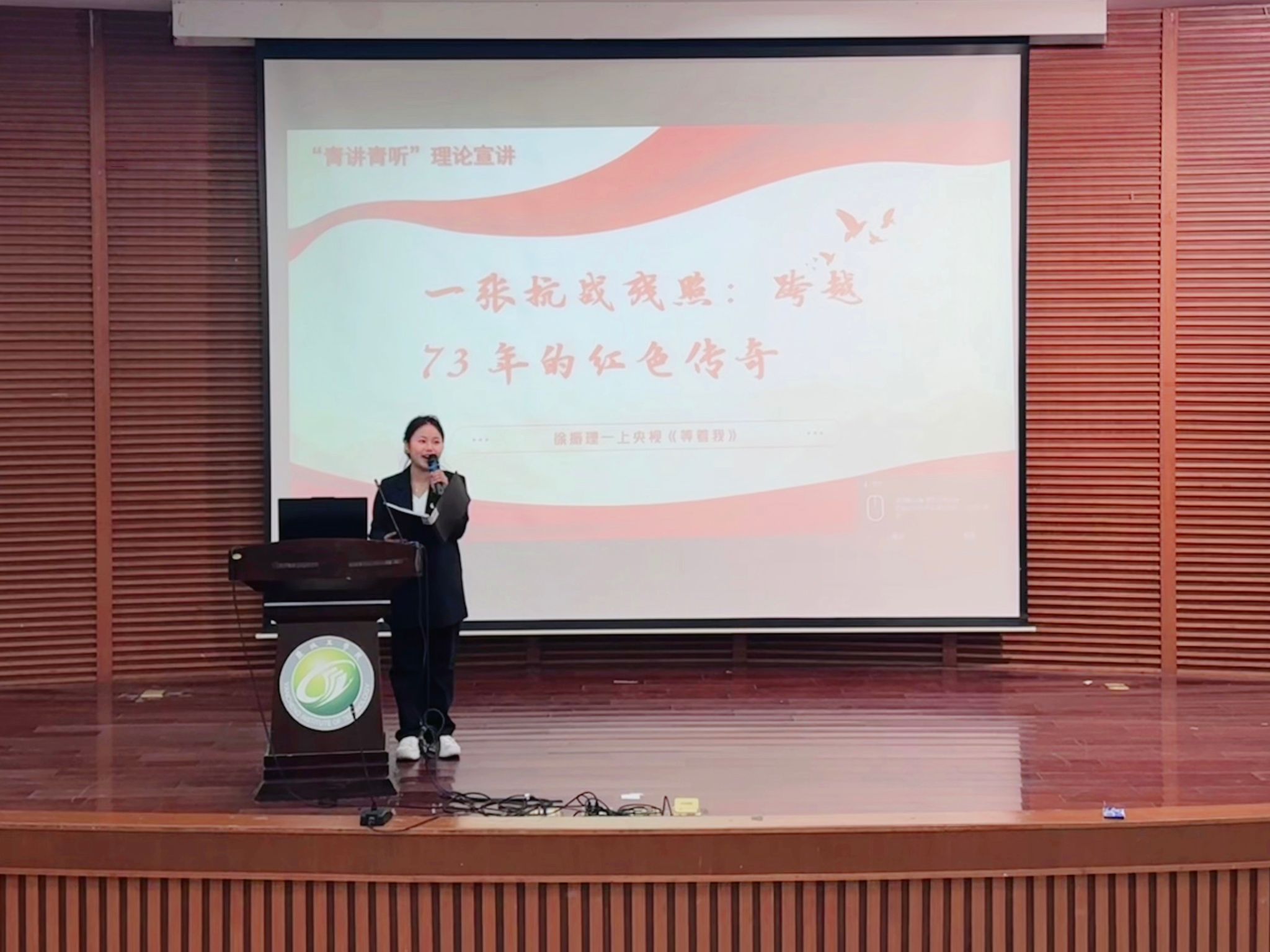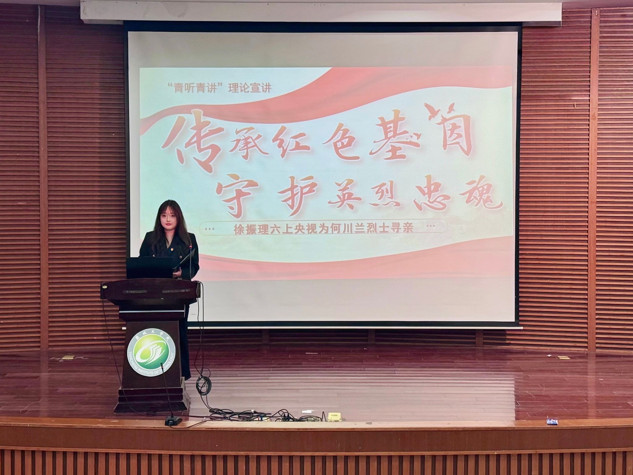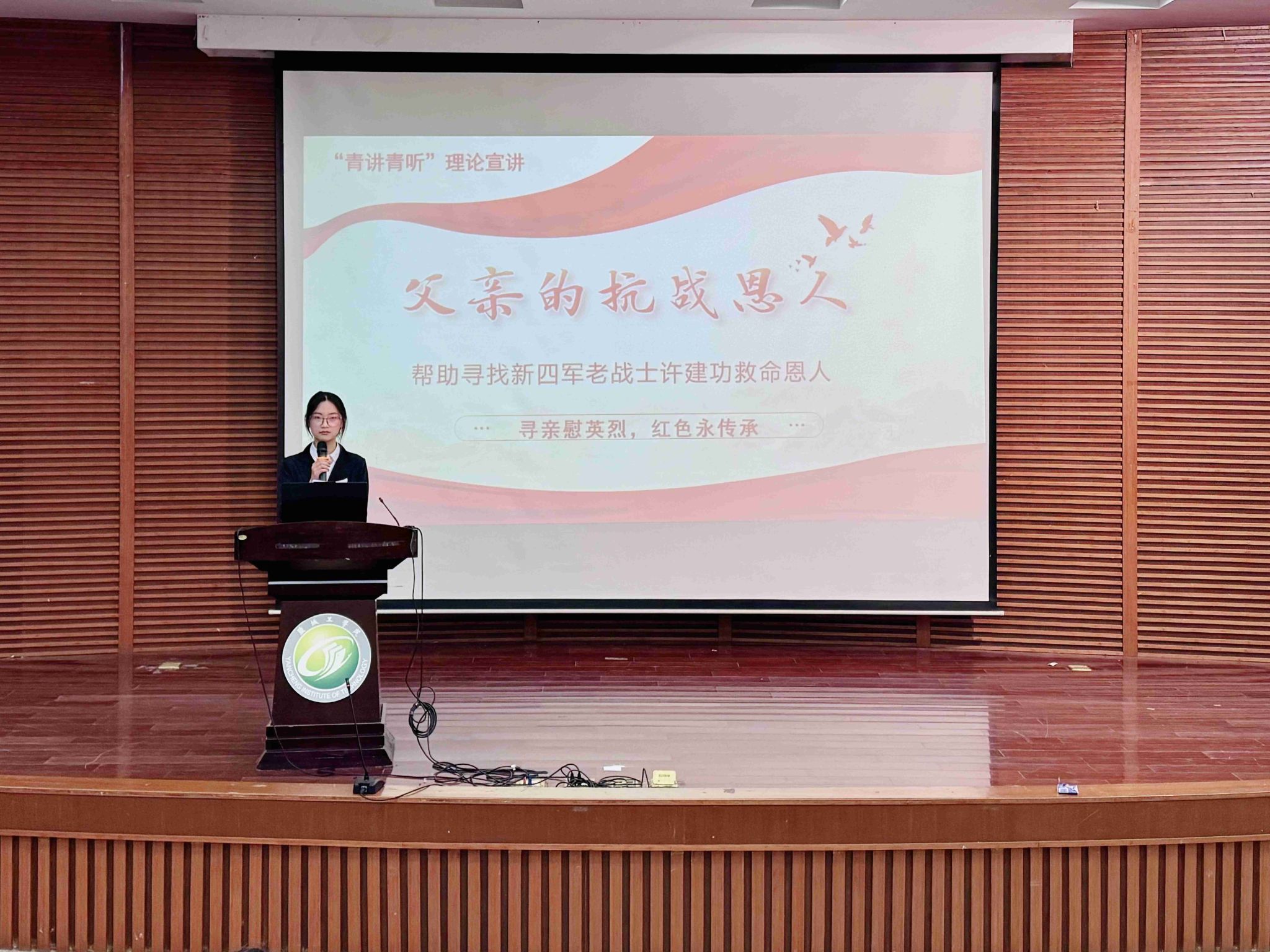 宣讲团成员围绕“寻亲慰英烈,红色永传承”主题,依次讲述了《一张特殊的“护身符”》《日军刺刀下的“盐阜红嫂”》《6代人76年的守望:辛立珍烈士魂归故乡》《一张抗战残照:跨越73年的红色传奇》《恩重如山:张庄老乡的生死守护》《传承红色基因:何川兰烈士的十年寻亲路》《藏在银镯里的思念》等七个感人至深的红色寻亲故事。从战火纷飞中烈士与亲人的隔空牵挂,到和平年代里后人跨越山海的寻亲坚守,一个个鲜活的人物、一段段揪心的过往、一次次执着的坚守,让尘封的红色历史变得可感可触、直抵人心,现场不时响起阵阵掌声。宣讲中,徐振理七上央视《等着我》的执着,请现场学子感受到英烈精神背后跨越时空的家国情怀。宣讲尾声,宣讲团成员结合新时代青年使命,将铁军精神与青年担当深度融合,引导同学们从红色故事中汲取奋进力量,把英烈精神转化为勤学笃行、练就本领的实际行动。
