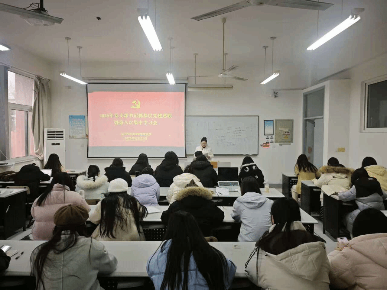 12月24日下午,我院学生党支部在润美楼A207召开2025年度基层党支部书记抓党建工作述职评议会暨第八次集中学习会。会议由党支部书记顾清做述职报告并主持,宣传委员韩晓晓领学,全体学生党员参加。
