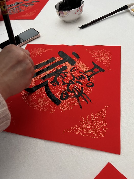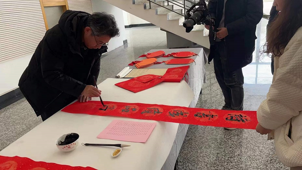 活动一开始,就吸引了众多教师的热情参与,党员们现场书写了近百副春联,隶书、楷书、行书等多种书体各显神韵。“春花含笑意,爆竹增欢声”“丹凤呈祥龙献瑞,红桃贺岁杏迎春”……一副副散发着清新墨香的大红春联展现在人们眼前,喜庆的话语蕴含着浓浓的年味。几位老师现场即兴创作,将可爱的小老虎融入“福”字斗方之中,为虎年新春增添了几分“生气”;在精美的扇面和卷轴上创作水墨小品画,绽放的腊梅尽显春意。老师们一边欣赏书法创作,一边品评春联寓意,现场一派欢乐景象。