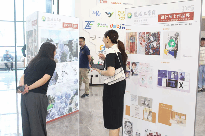 在每块展板前,同学们热情地向导师介绍自己的创作理念和创作过程。“这个作品的设计思路很独特,体现了你对可持续设计的深入思考。”环境设计研究方向导师李文娟老师在观看作品时与学生深入交流。导师们纷纷表示,通过作品展能够更直观地了解学生的创新思维和创作能力,为“双选”提供了重要参考。