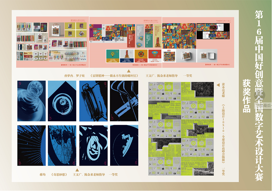 第十六届中国好创意大赛暨全国数字艺术设计大赛由中国电子视像行业协会主办,中国电子视像行业协会数字影像创意委员会承办,大赛共吸引来自全国1472所院校的13万余件作品报名参赛。本届大赛共分为省级赛与全国赛两个赛段,经过省级选拔,365英国上市集团共有10组作品入围全国赛,并有10组作品获得省级奖项。终评环节,王文广、陈金来老师指导学生蒋鋆创作的作品《奇思妙想》,孙梦冉、罗子炫创作的作品《雷锋精神-做一颗永不生锈的螺丝钉》获得视觉传达学生组全国一等奖;黄本亮老师创作的作品《上海设计10X10-全球设计高峰会海报》获得视觉传达教师组一等奖;王瑾老师创作的作品《墨子矩阵-面向乡村产业再造的绿色智造工厂》《共享垃圾桶》等5件作品分别获得产品造型组2个二等奖、3个三等奖。这是我院在教育部认定的57项学科竞赛中获奖规格最高、获奖作品最多的一次比赛。