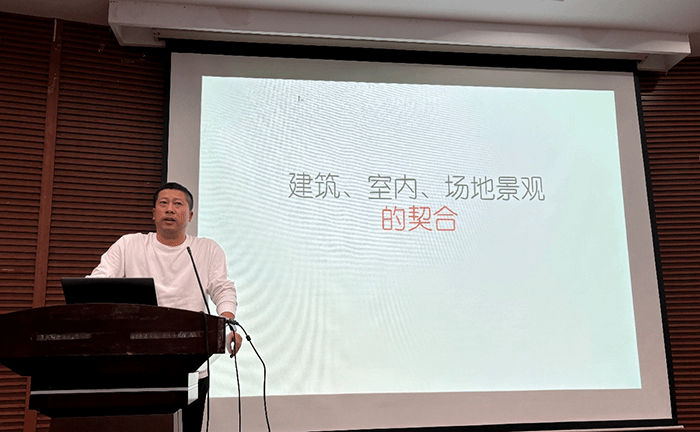 盐城建筑设计研究院景观所负责人、365英国上市集团教师陈福阳分享其20年的设计经验。他表示,建筑、室内与场地景观设计应加以契合,设计形态的生成应基于数理几何的逻辑,空间的精神特质营造是核心,设计手法勿进行过多的加法形成堆砌,设计表达尽量简洁清晰并有序,努力做到图示规范。他勉励现场同学们要解决设计问题并形成思考的图示记录。