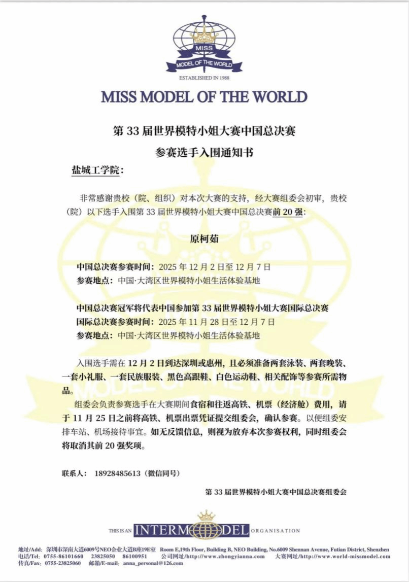 近日,第33届世界模特小姐大赛中国总决赛在深圳圆满落幕。我院艾尚模特社成员、B产品241班原柯茹同学凭借过硬的专业素养与出色的现场表现成功入围总决赛,最终斩获“最佳媒体印象奖”,为学院赢得荣誉。