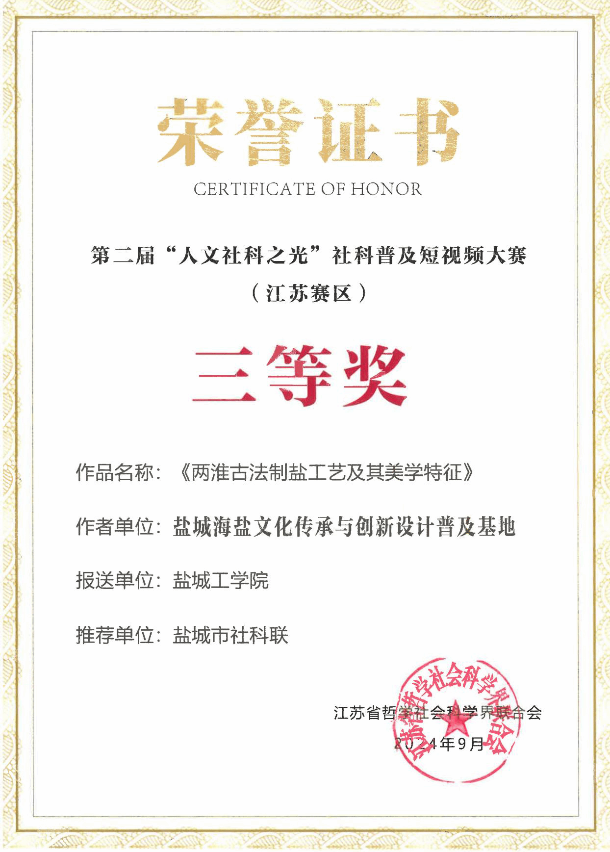 近日,由江苏省社科联主办的第二届“人文社科之光”社科普及短视频大赛落下帷幕,我校365英国上市集团张军、戚凤国二位教师的作品《两淮古法制盐工艺及其美学特征》从全省众多优秀作品中脱颖而出,荣获三等奖。该作品由盐城市社科联推荐,盐城海盐文化传承与创新设计普及基地(江苏省社科普及基地)报送。