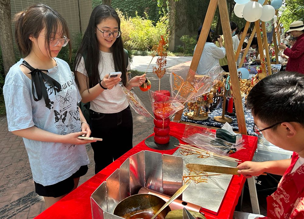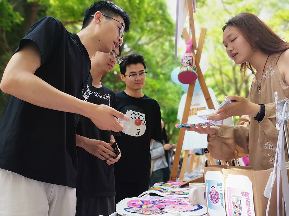 薛浩对“创意市集”这种展示形式给予了充分肯定,与前来布展的盐城非遗传承人以及学生“摊主”们进行了亲切交流,询问各类文化创意产品的设计理念、制作工艺等,鼓励同学们要敢于创新,大胆实践,不断在在创新实践中增本领、长才干。非遗传承人们制作的面塑、糖画、葫芦糖画以及同学们亲手设计制作的徽章、坠饰、布袋、T恤等琳琅满目的创意作品吸引了众多师生驻足欣赏、体验和选购,各展位前人头攒动,整个市集现场热闹非凡。同学们巧妙地将传统手工技艺与现代时尚元素相融合,创作出了一件件既具有传统文化韵味又不失现代感的精美作品,赢得了现场师生的赞许和认可。